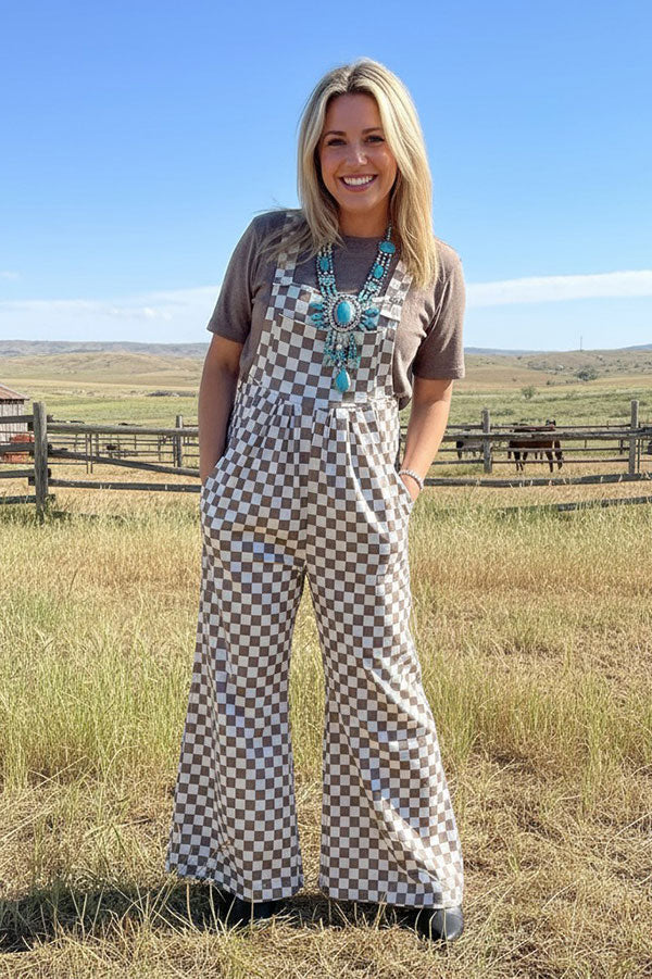 - Jumpsuit features with brown/white checkered printed with adjustable straps and pockets.