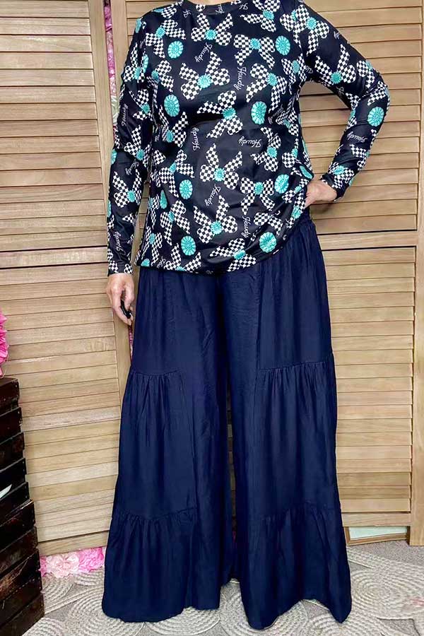 - Pant featurs with solid color navy blue with elastic high waist & straight and wide legs.
