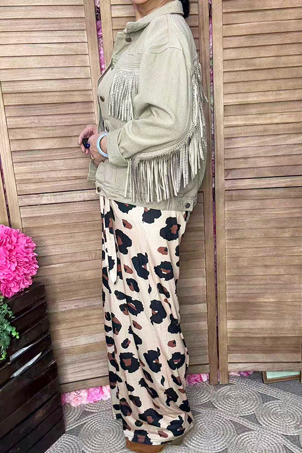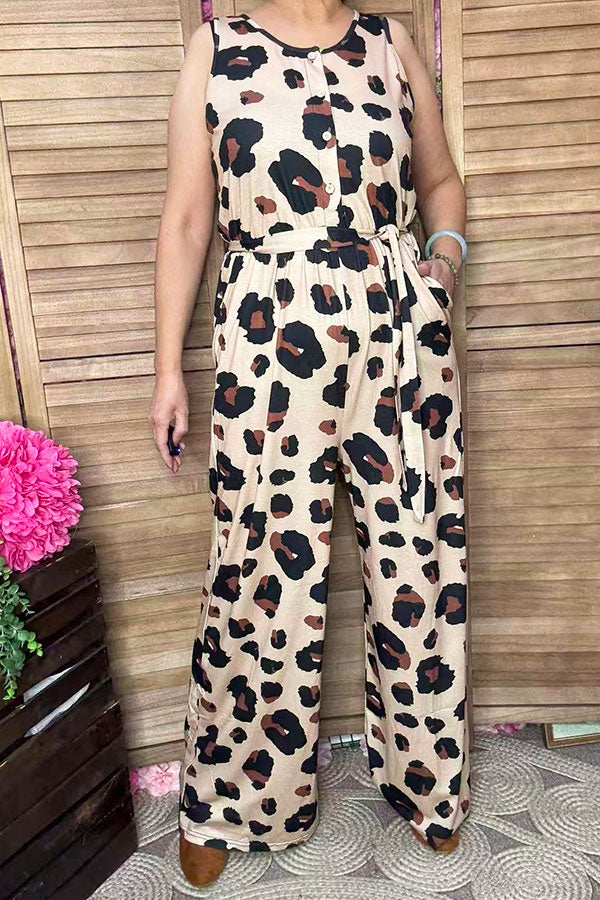 - Jumpsuit with Leopard prints with waistband and pockets, V-neckline and buttons at front.