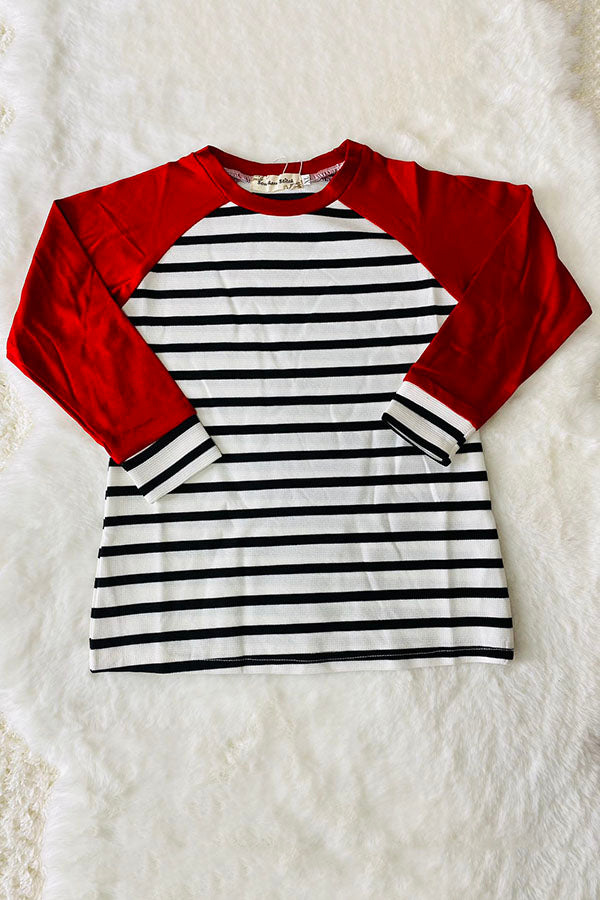 - Top features with black/white stripe with solid red raglan long sleeves.