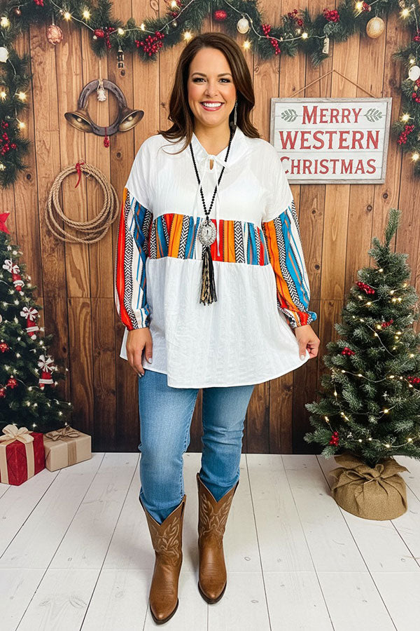 - Top features with multi color striped printed w/string white long sleeves.