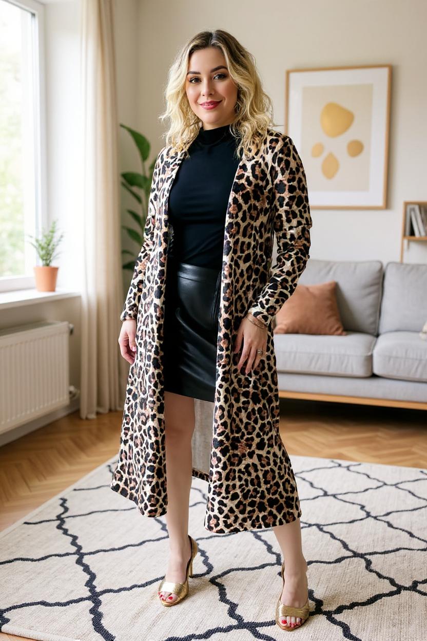 - Cardigan features with tan/brown leopard printed & long sleeve & open long style.