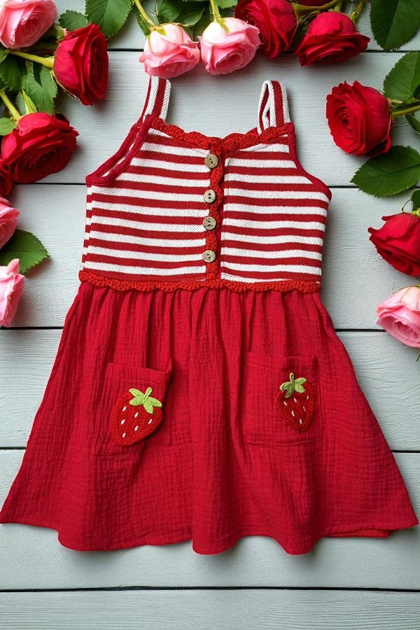 - Dress features wtih knitted red/white striped with solid red gauze color block with strawberry pockets & front buttons.
