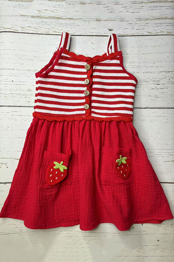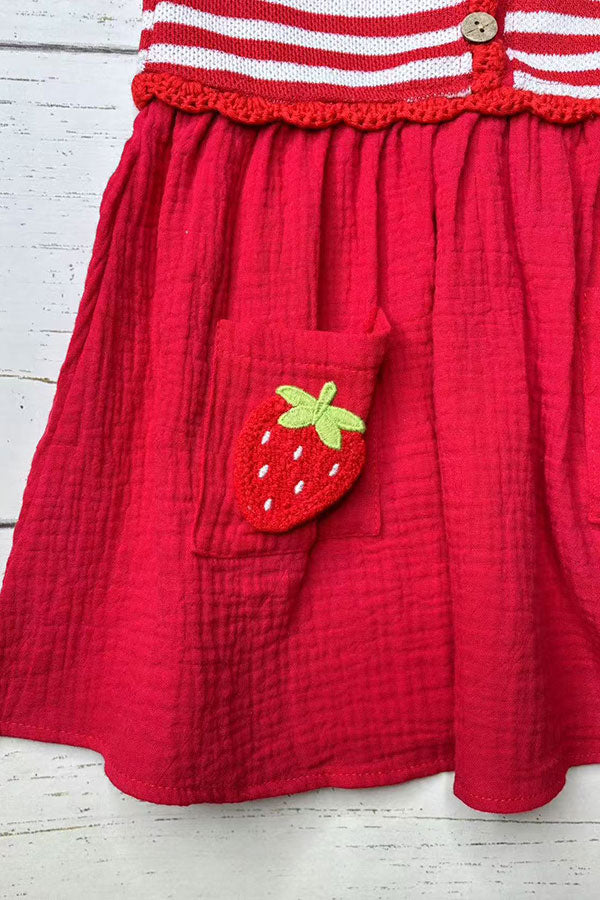 Knited red striped & red gauze strawberry pocket girls dress DLH2844 (A2S8)