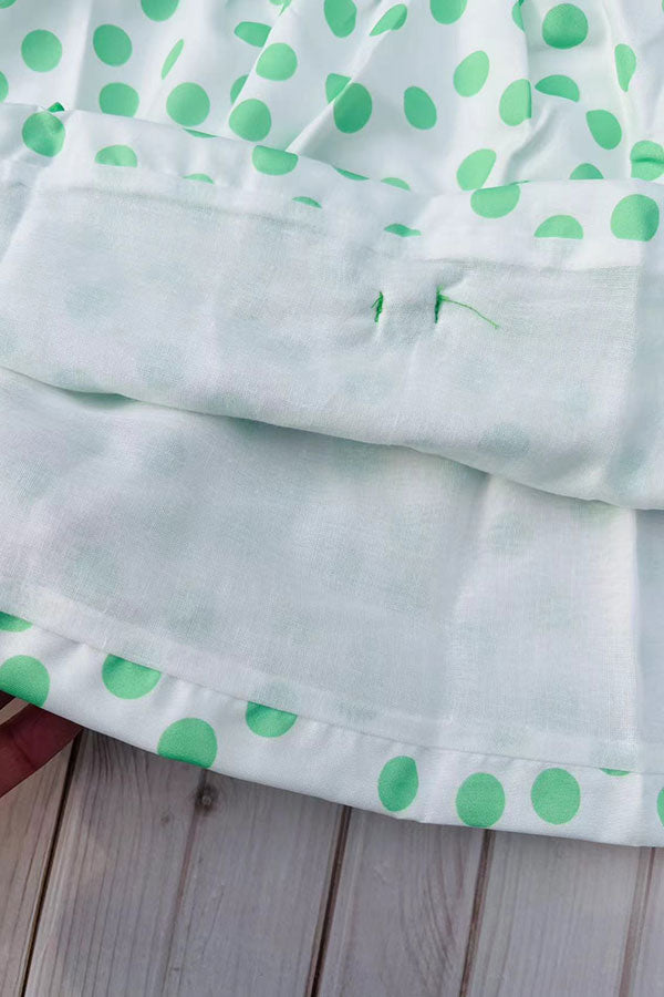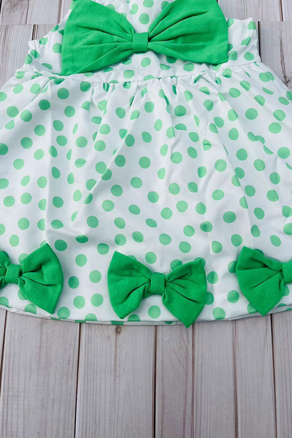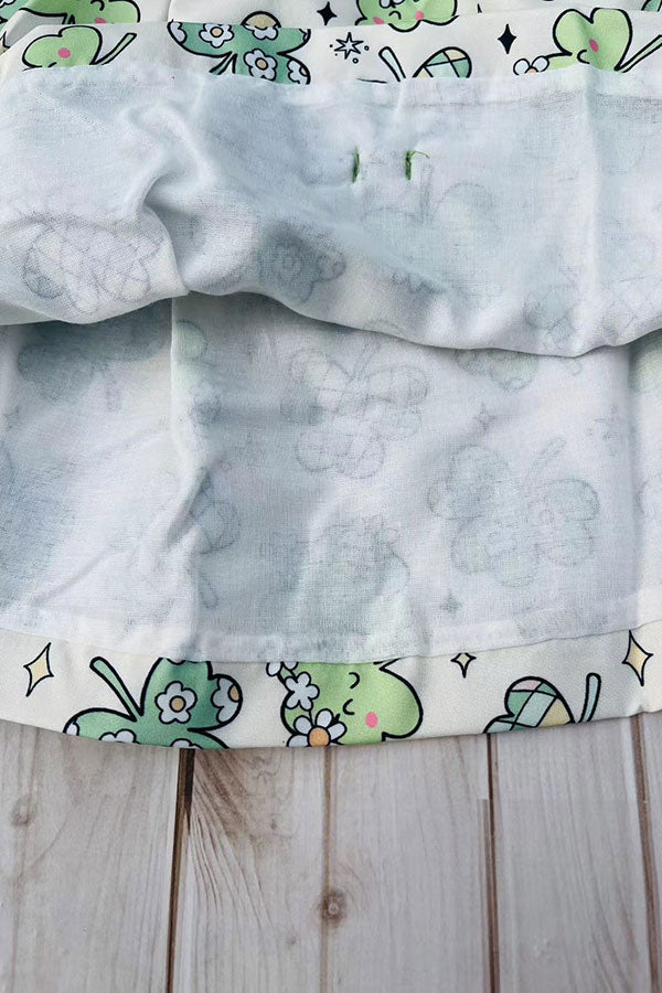 - Dress feathres with four-leaf cloverprinted with green bows.