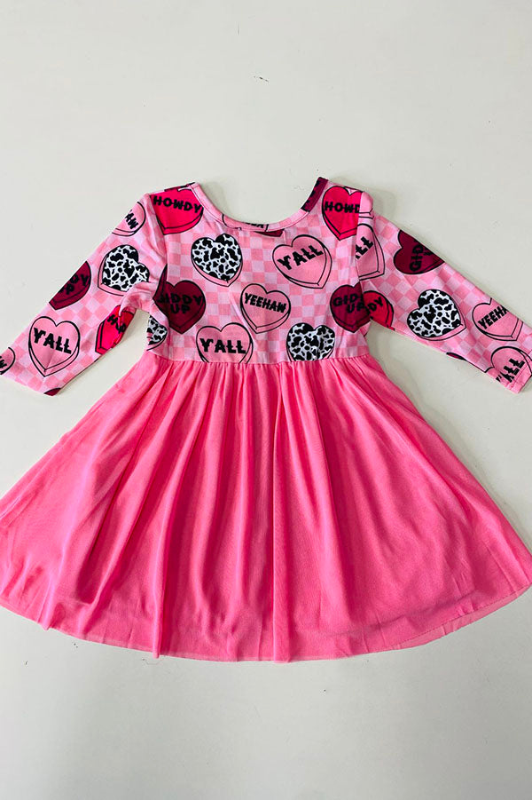 • Dress features HOWDY & YALL & YEEHAM & Cow hearts prints on pink plaid background with pink tulle & long sleeves.