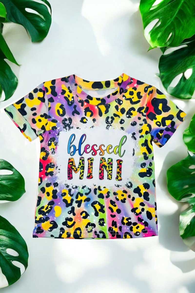 - Top features with "Blessed Mini" printed on multi color leopard background with short sleeves.