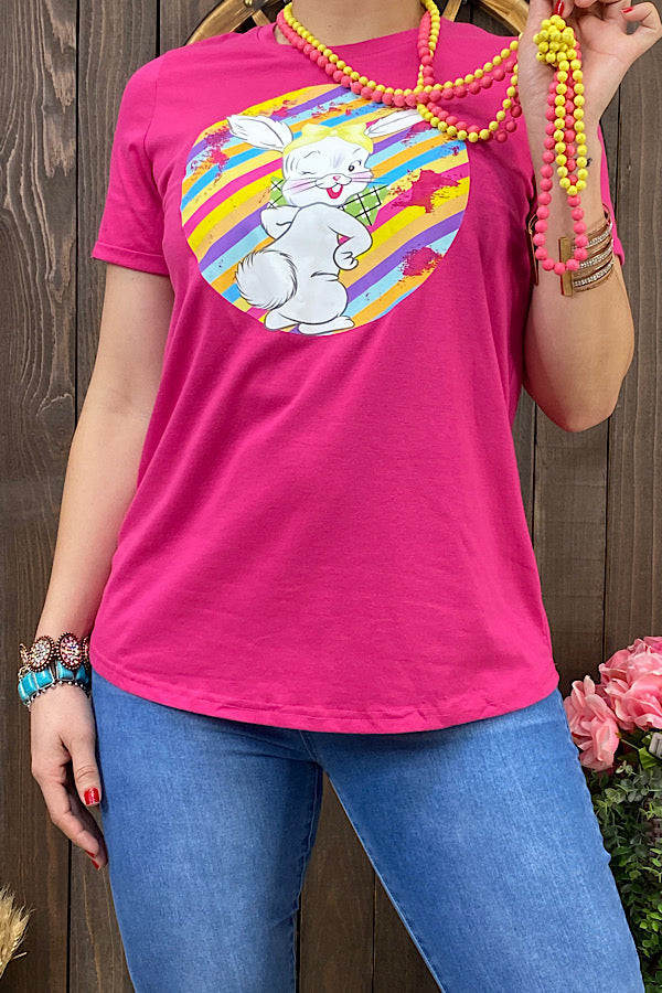 DLH10495 Fuchsia Cute bunny easter printed short sleeve women t-shirt IFloor