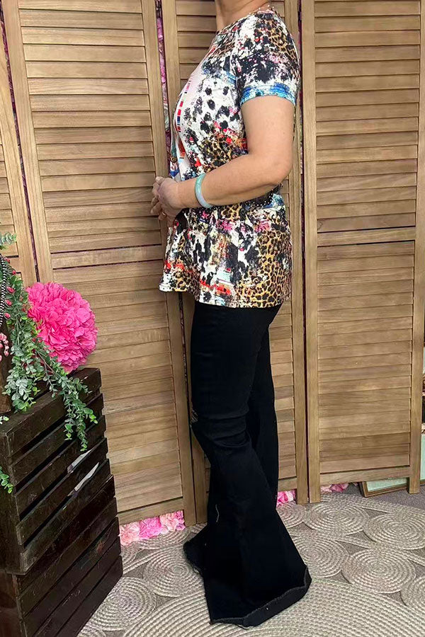 - Top features with sunflower crossed printed on tie dye leopard background with short sleeves.