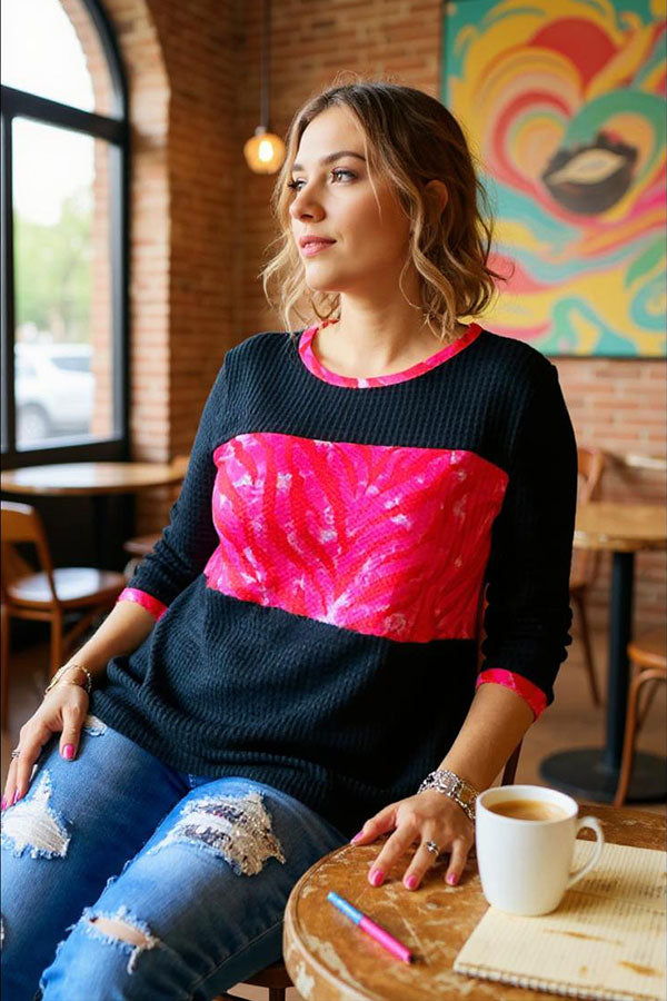- Top features with fuchsia printed & black color block & 3/4 sleeves.