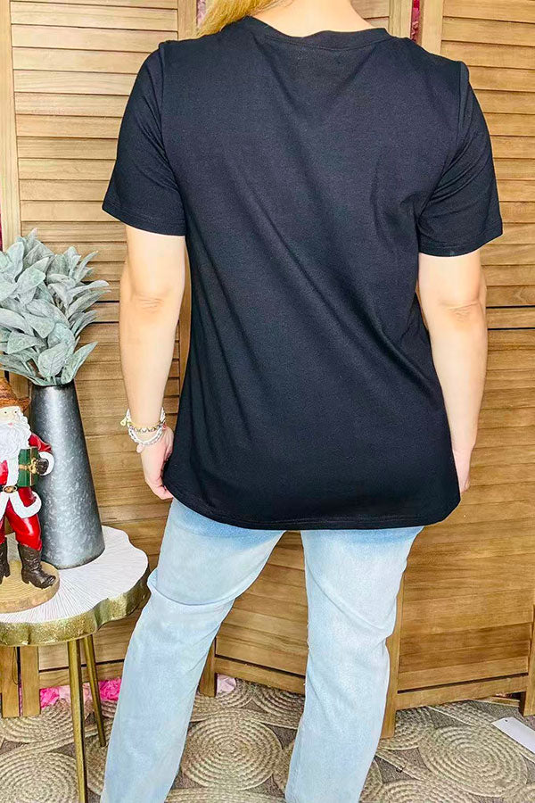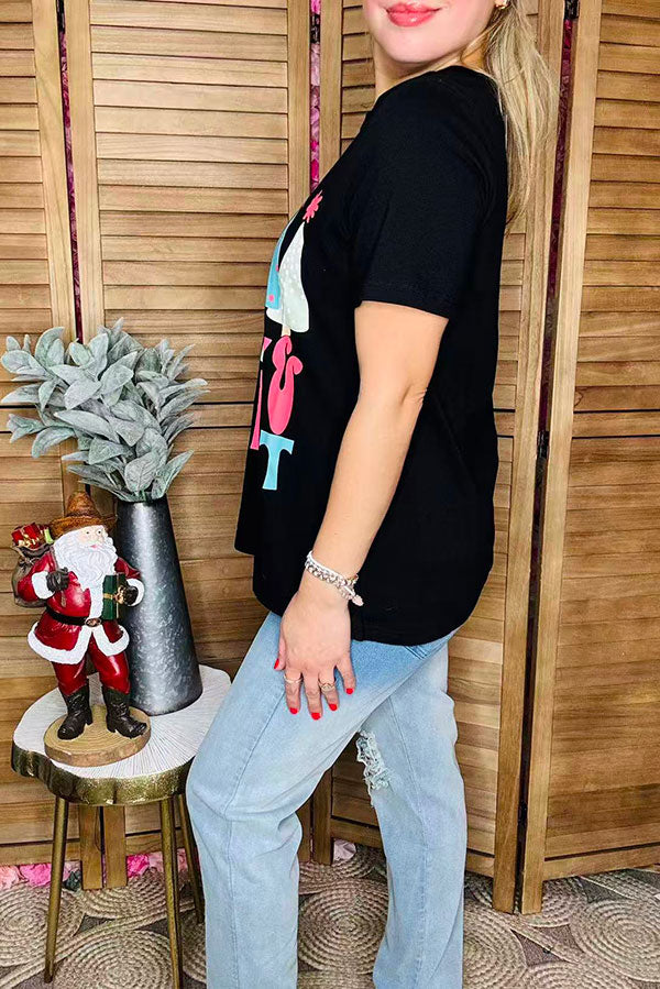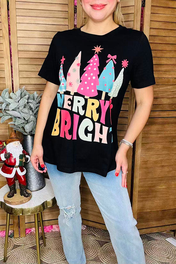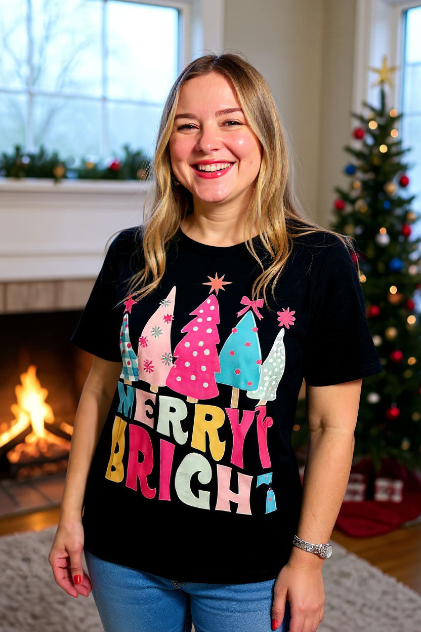 - Top features with "MERRY BRIGHT" wording & Christmas tree printed on black background with short sleeves.