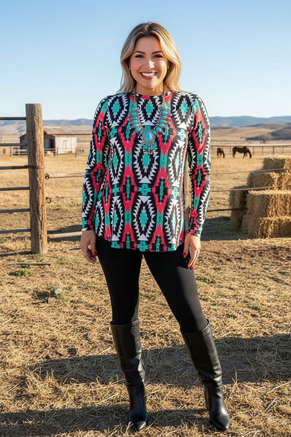 Western aztec printed long sleeve women tunic XCH16591