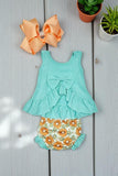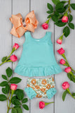 - Bloomer features aqua & orange floral print w/aqua ruffles.