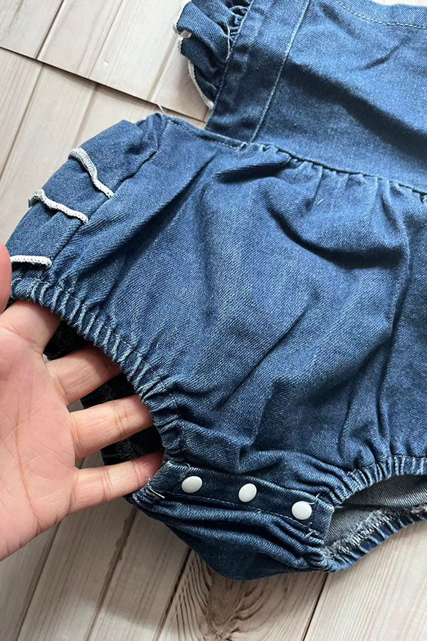 - Romper features with solid color blue denim fabric & triple ruffles at back side.