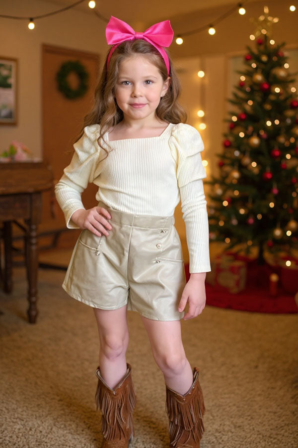 Cream knitted long sleeve top & Leather shorts girls sets DLH2717 (A7S5)