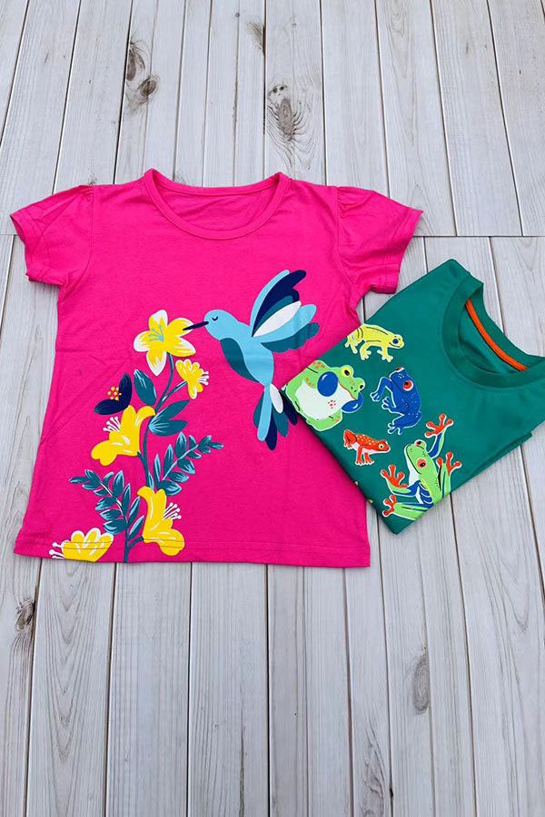 Bird & floral printed fuchsia puff short sleeve girls t-shirt 2601023M