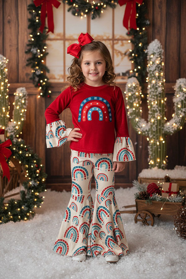 - Bottom red rainbow prints bell bottom, matching top as a set.