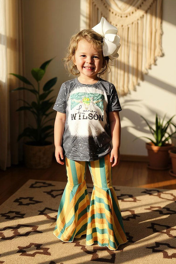 Bull printed grey top striped bell bottom 2pc girls sets DLH2737 (A5S7)
