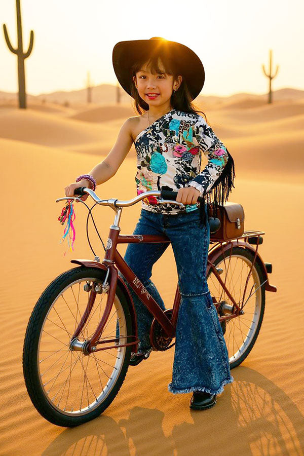 Kids Half sleeveless PUNCH & printed girls top w/tassel DLH2479