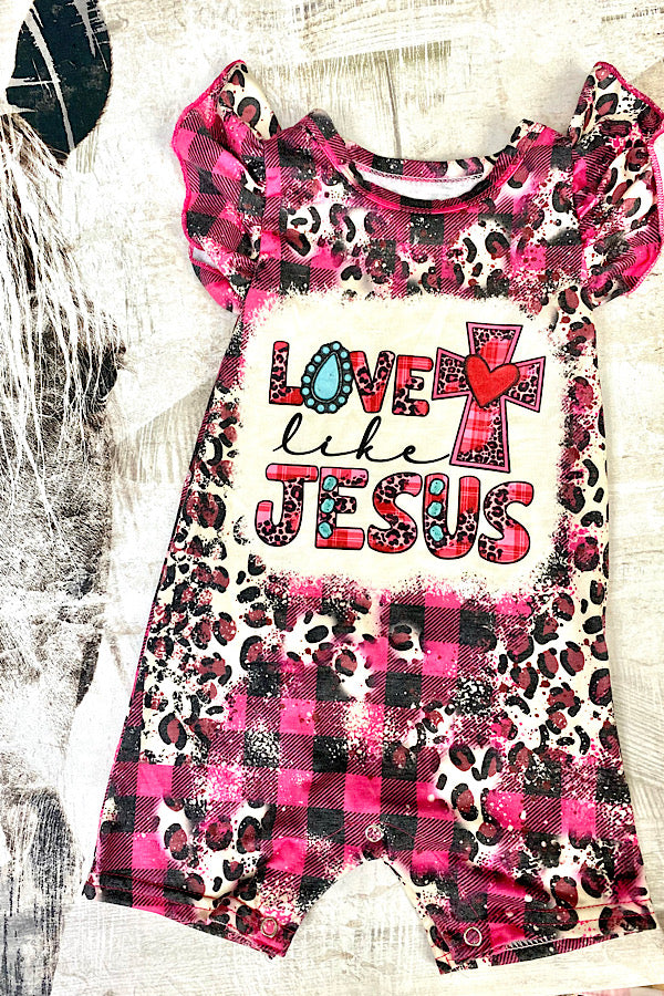 - Romper features LOVE LIKE JESUS prints on pink plaid background with ruffle short sleeves.
