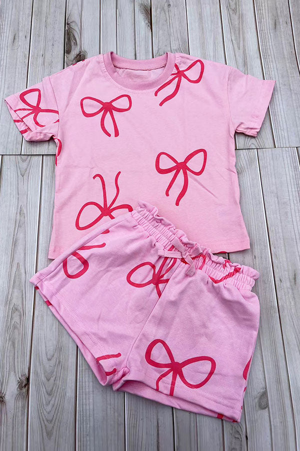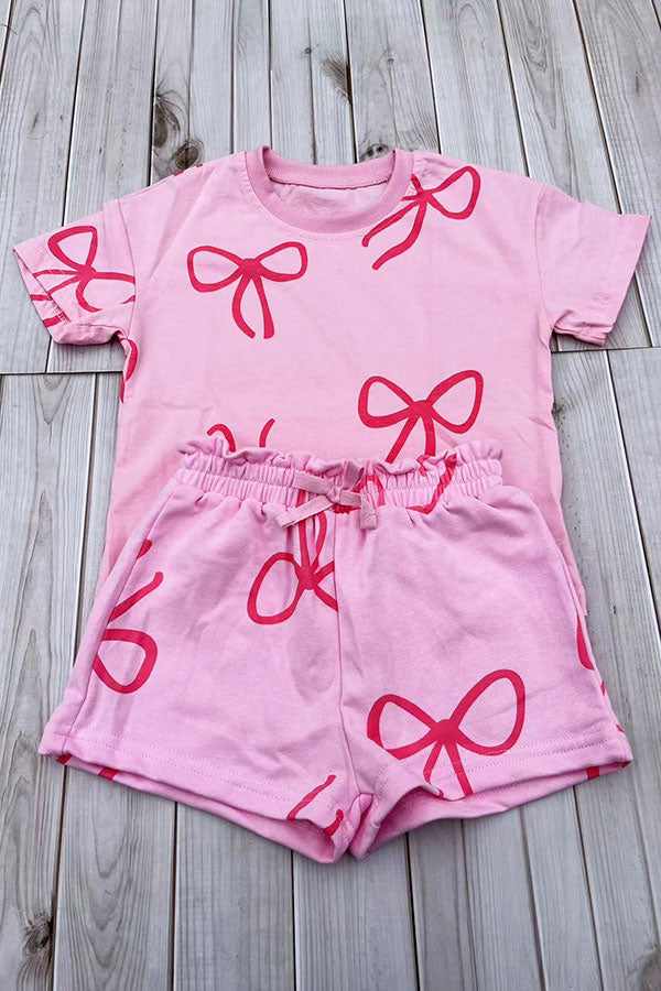 Pink bows printed short sleeve top & shorts 2pc girls sets 2601016M