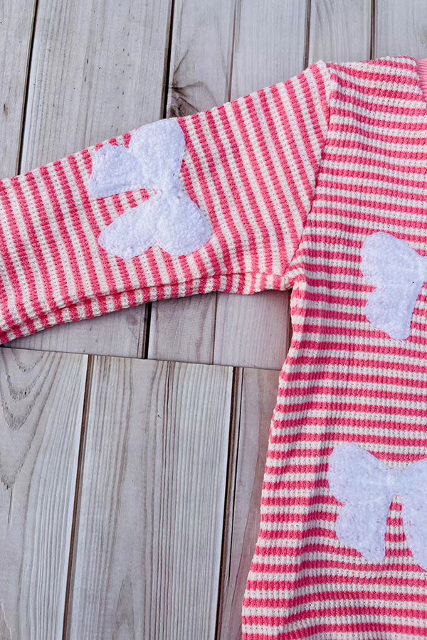 - Top features with pink striped knitted fabric with long sleeves & white bows.