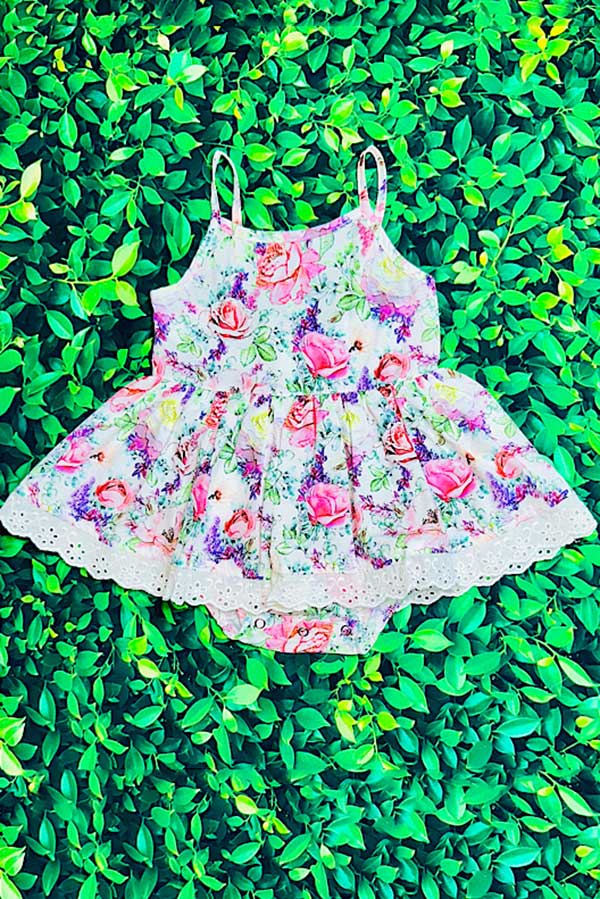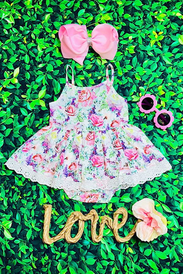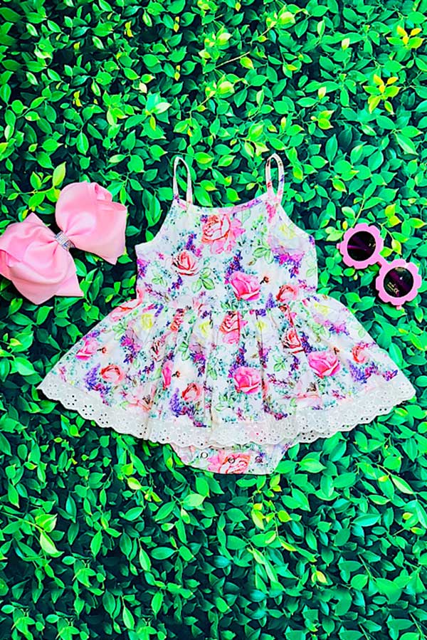 - Romper features pink & purple floral print w/white lace & sleeveless cut.