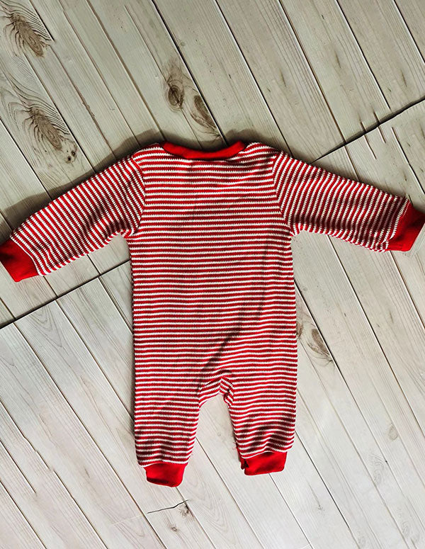 - Romper features with knitted fabric red stripes with hearts embroidery & snap buttons.