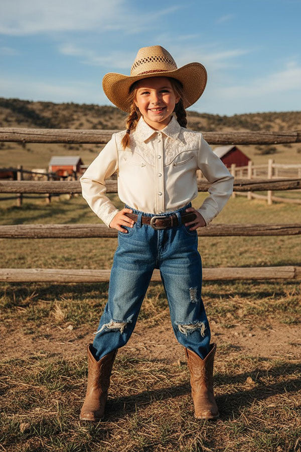 Western washed blue denim fabric girls jeans with holes DLH2663