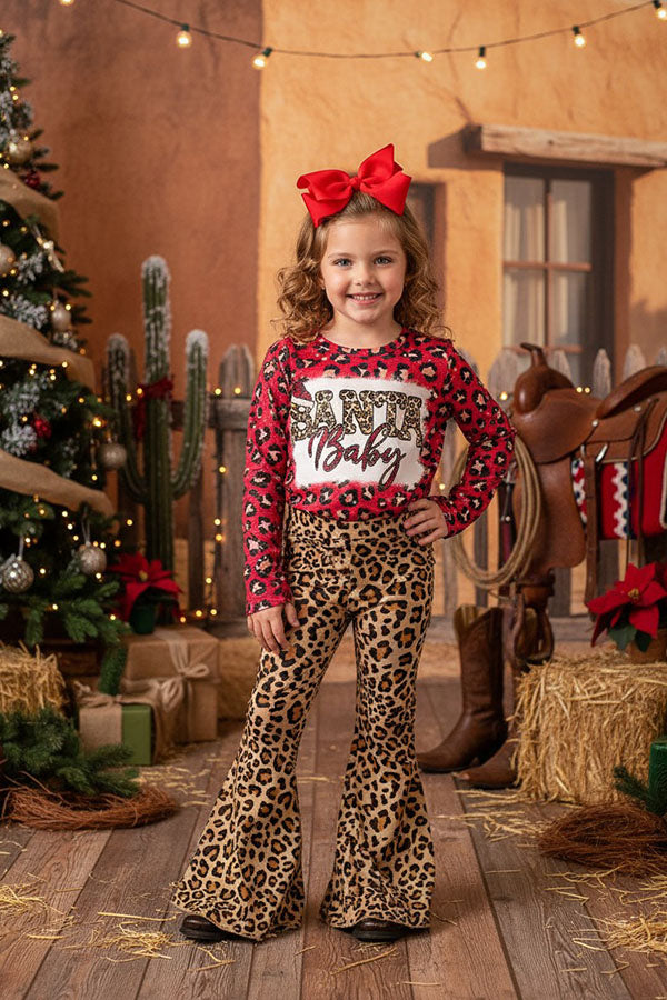 - Top features "Santa Baby" prints on red leopard background with long sleeves.