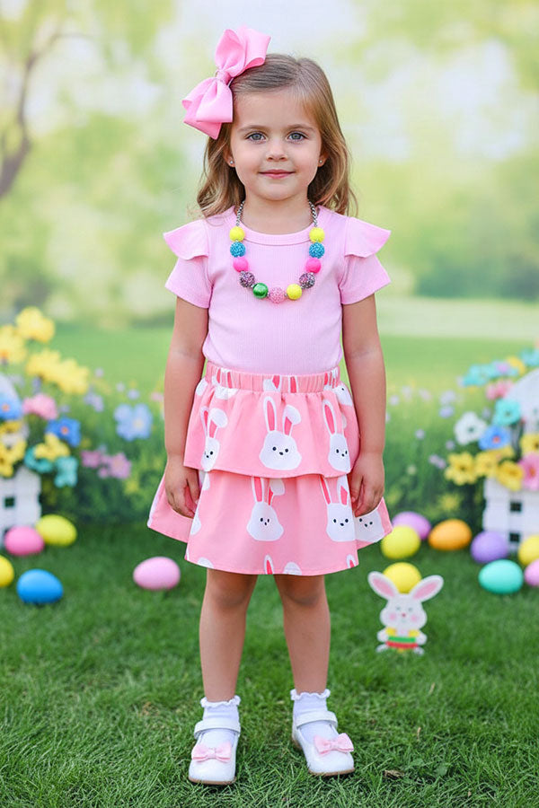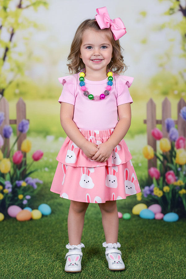 • Bunny printed pink double ruffle skirt match the top as a set.