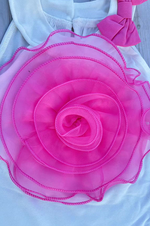- Top features with pink rosette at the chest & halter collar & pink bow.