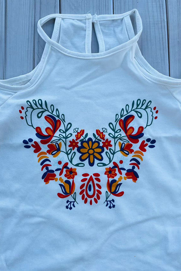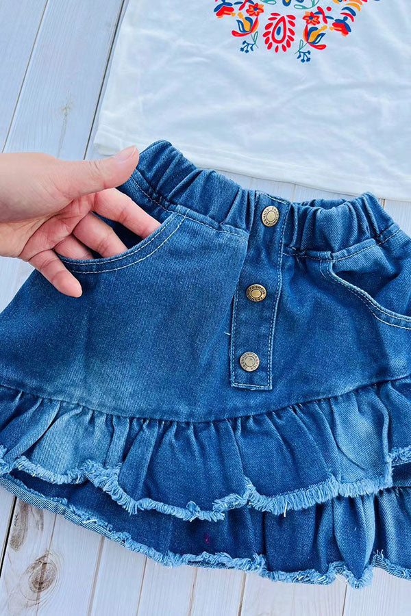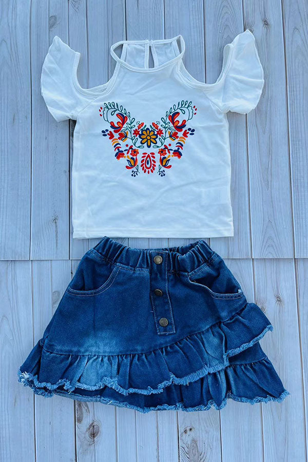 Cold shoulder sleeves floral printed white top & denim skirt 2pc girls set 251294M A10S8