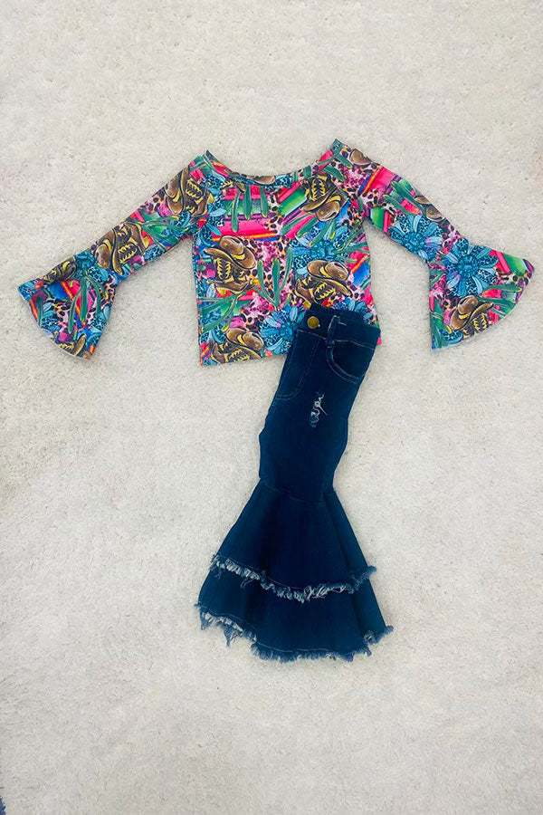 - Top features with cowgirls cactus printed wtih bell sleeves.
