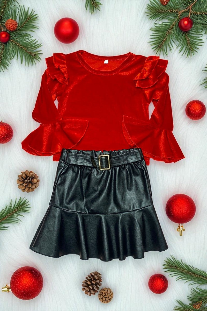 Red velvet ruffle sleeve top & leather skirt girls outfit sets DLH2635 (A5S4)