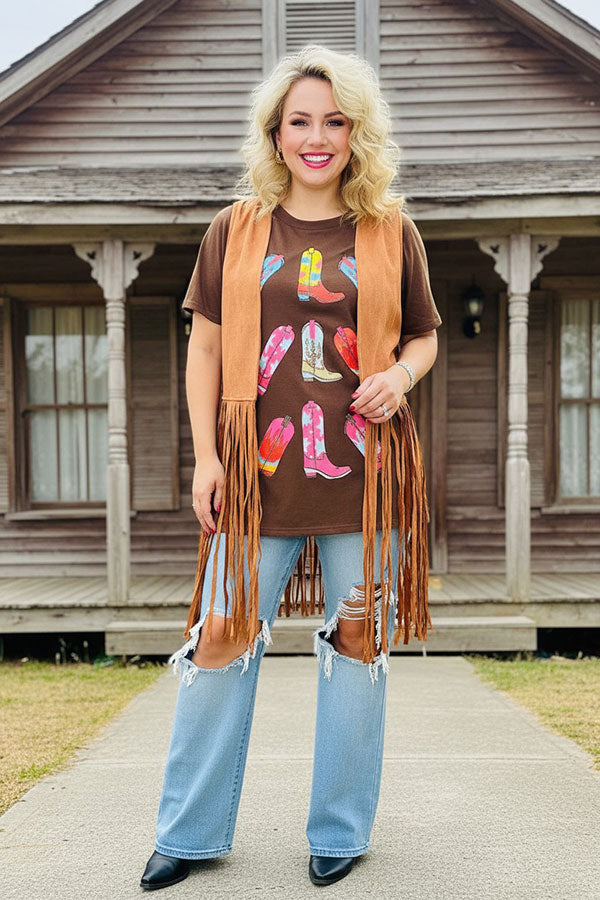 - Cardigan features with solid tan suede fabric with long fringe tassel & sleeveless cut.