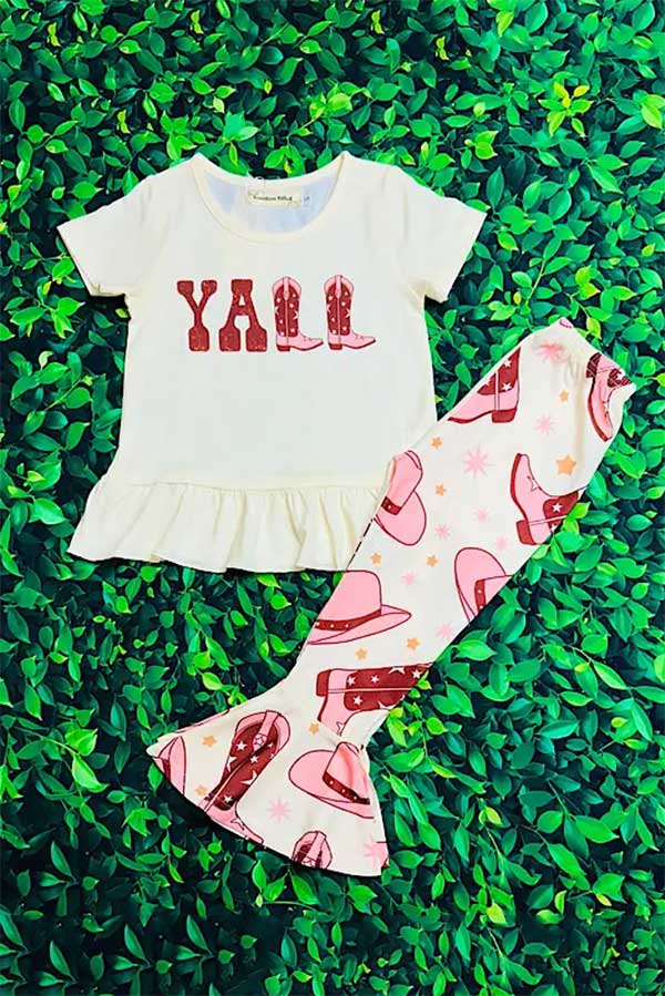 - Top features "YALL" wording w/western boots as logo on cream background & short sleeve cut.