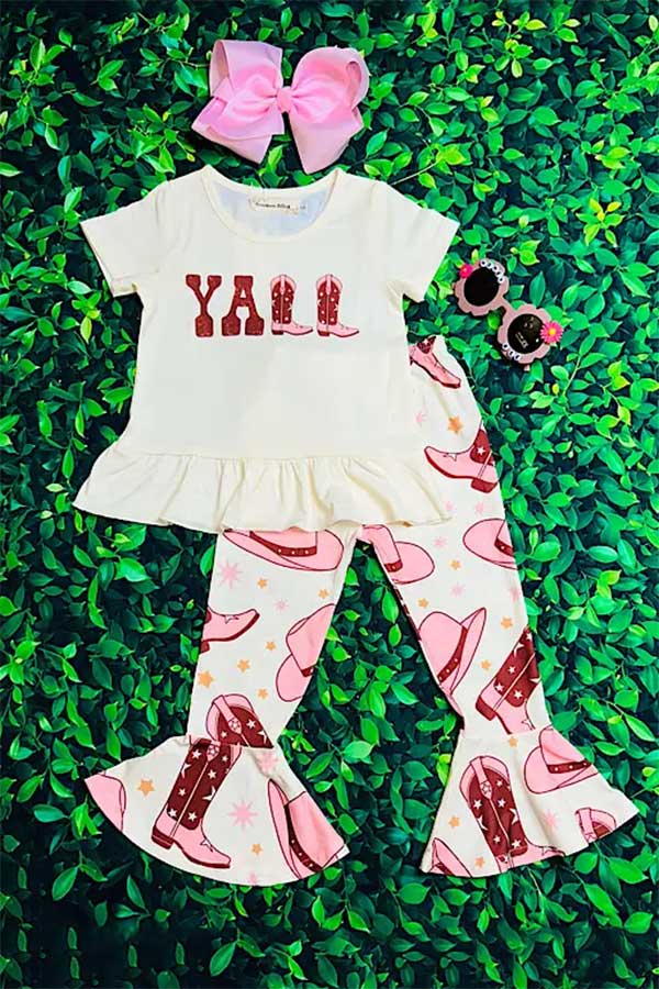 - Bottoms feature western pink boots & hats on cream background & flare legs.