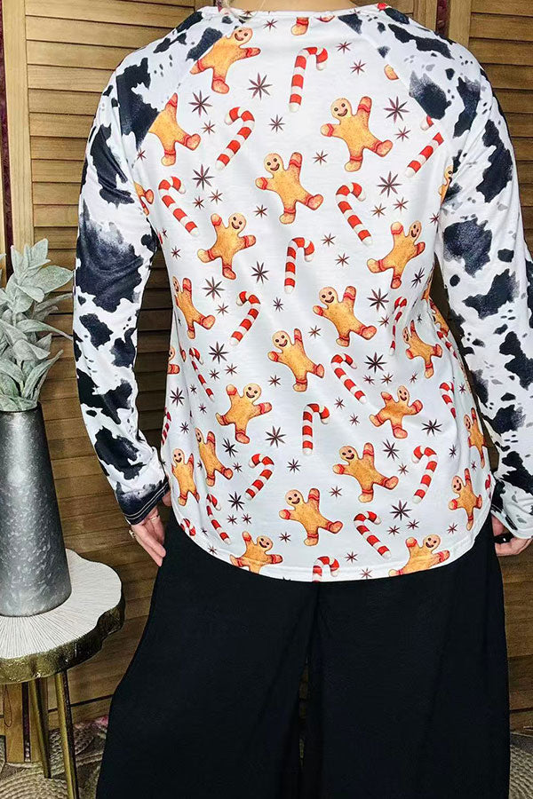 - Top features with gingerbread printed on white background with cow prints raglan long sleeves cut.