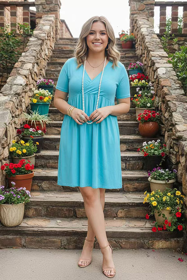 GJQ14589-2 Solid color blue short sleeve women dress w/pockets (BS6 AS9