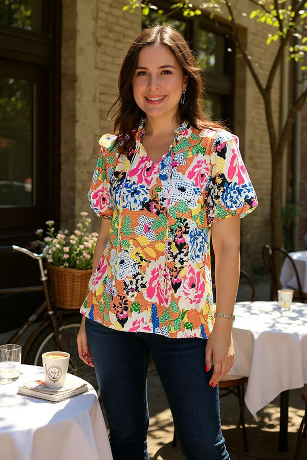 Multi color abstract printed puff short sleeve women blouse XCH15931(CS1)