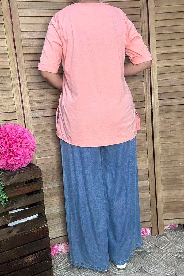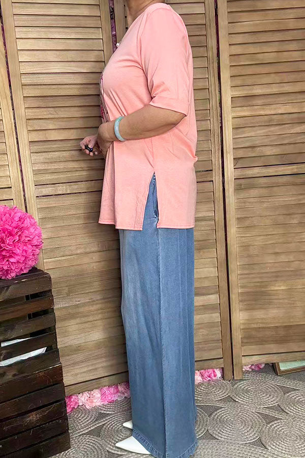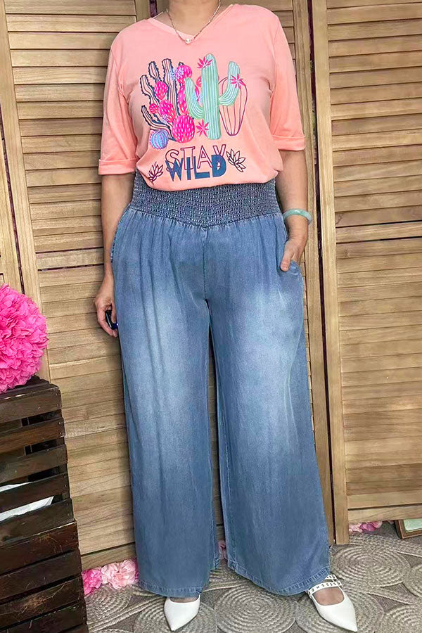 - Top features wording "STAY WILD" & cactus prints on pink background with short sleeve with side slits.