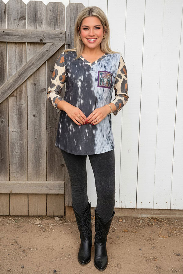 - Top features black white tie dye with bull printed and 3/4 leopard sleeves.
