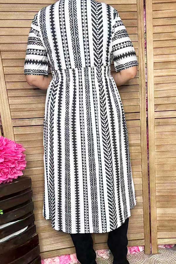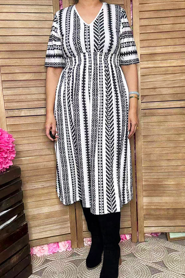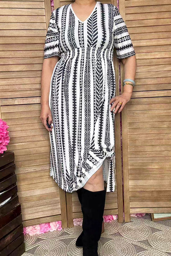 - Dress features with white and black geometric printed with elastic waist & short sleeves & v-neckline and side slit at bottom.