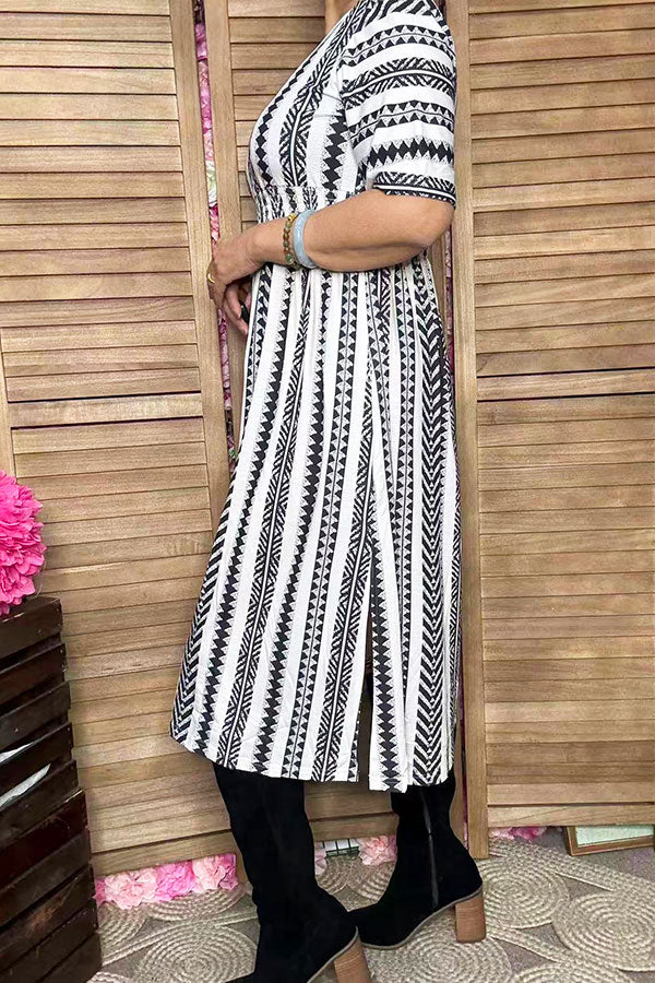 Black & White Geometric Short Sleeve Women Midi Dress w/slit GJQ16338 Afloor