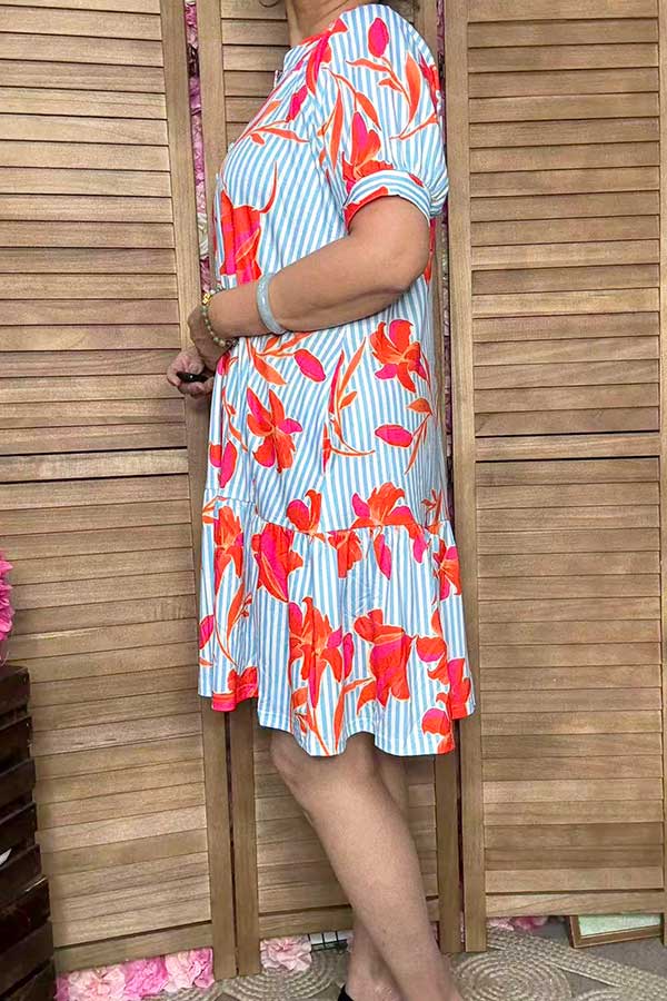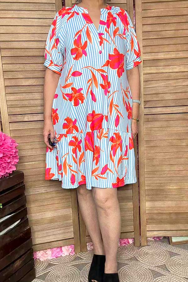 • Dress features with pink floral with blue striped printed & raglan short sleeve & ruffle baby doll style with v-neckline.