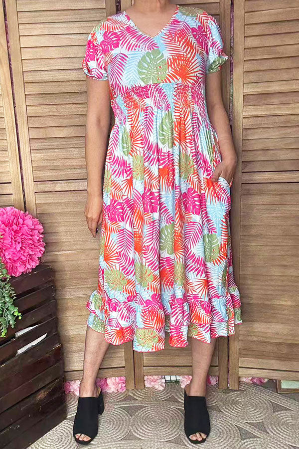 - Dress features multi color leaves prints with elastic waist & puff short sleeves & V-neckline.