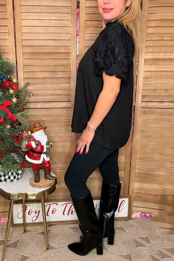 - Top features with solid color black ribbed knitted fabric with lace puff short sleeves with v-neckline.