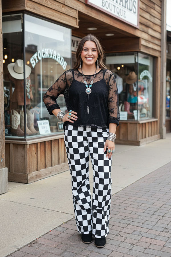 - Pant features with black & white checkered patterns & inside zipper & pockets & flare legs
