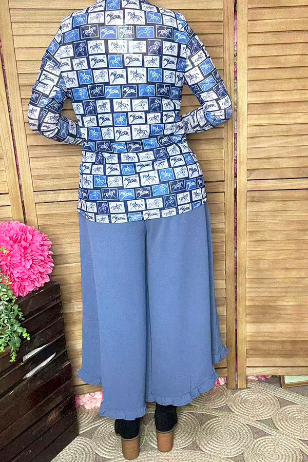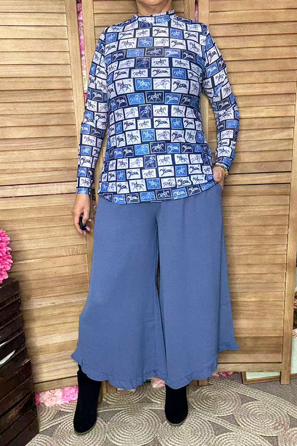 - Top features with blue/white horse riding printed on mesh fabric with long sleeves.